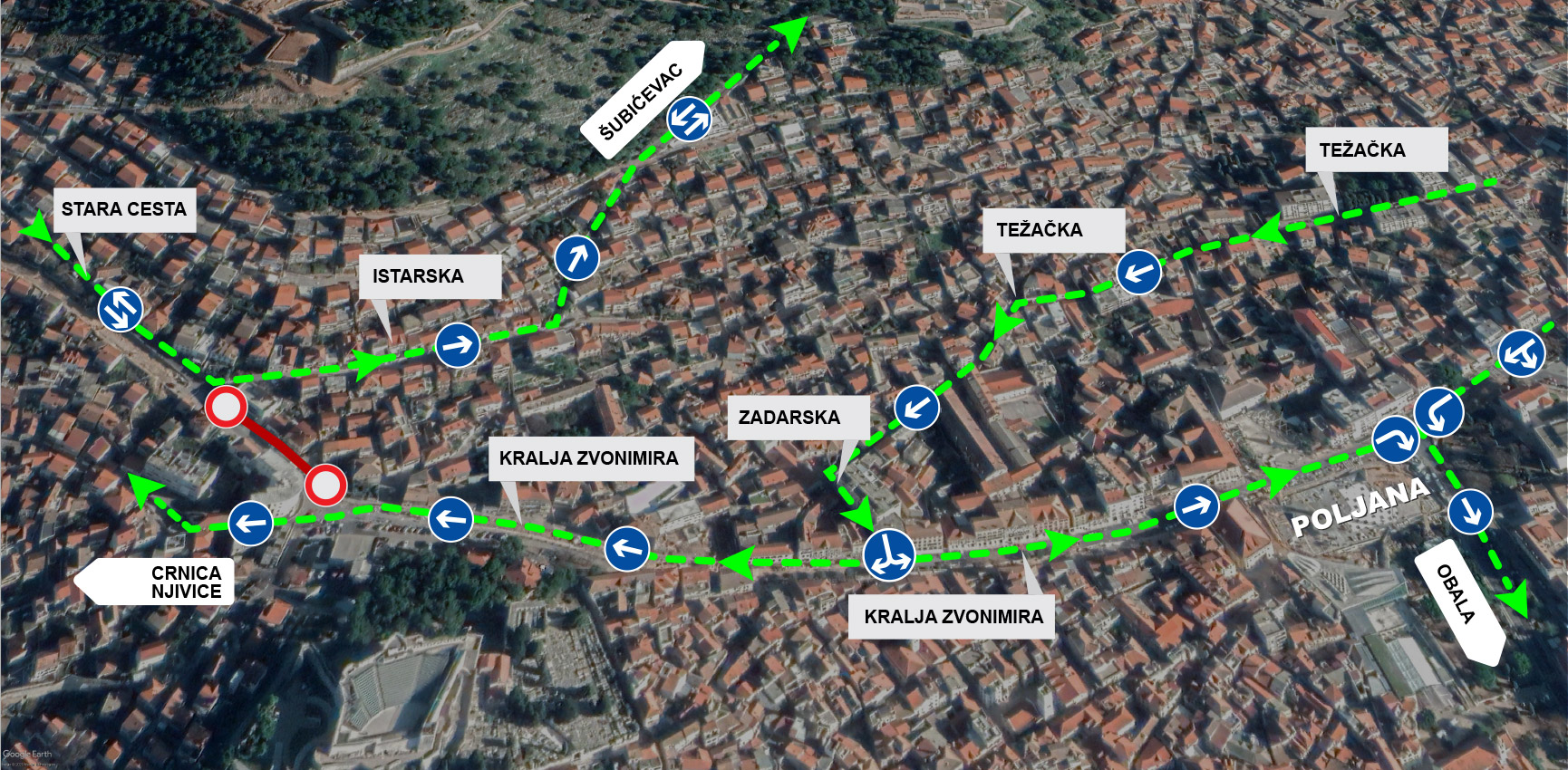 Dionica od Stare ceste do križanja ispred Doma zdravlja u potpunosti se zatvara za sav promet. Pristup ovom dijelu grada više neće biti moguć iz pravca Stare ceste, već će se moći pristupiti isključivo trasom iz Zadarske ulice, desno Ulicom kralja Zvonimira do Doma zdravlja te dalje kroz Crnicu prema Njivicama.